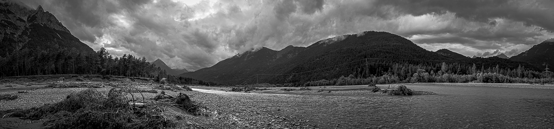 Zeit | Bei Vollmond hebt sich der Lech aus dem Schottergeschiebe und schürft sich bei Neumond »ånderscht« wieder ein. Durch diese Macht des Wassers verändert sich der Flusslauf unaufhörlich in der Zeit. Das Schmelzwasser reisst alles fort — unvermeidlich.