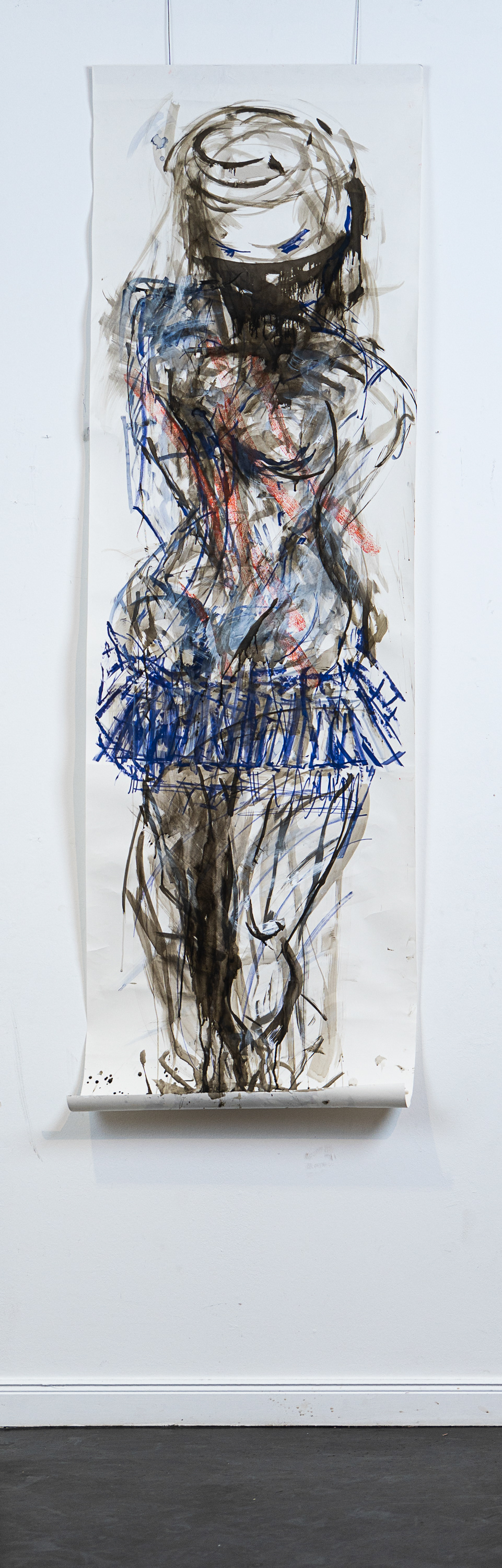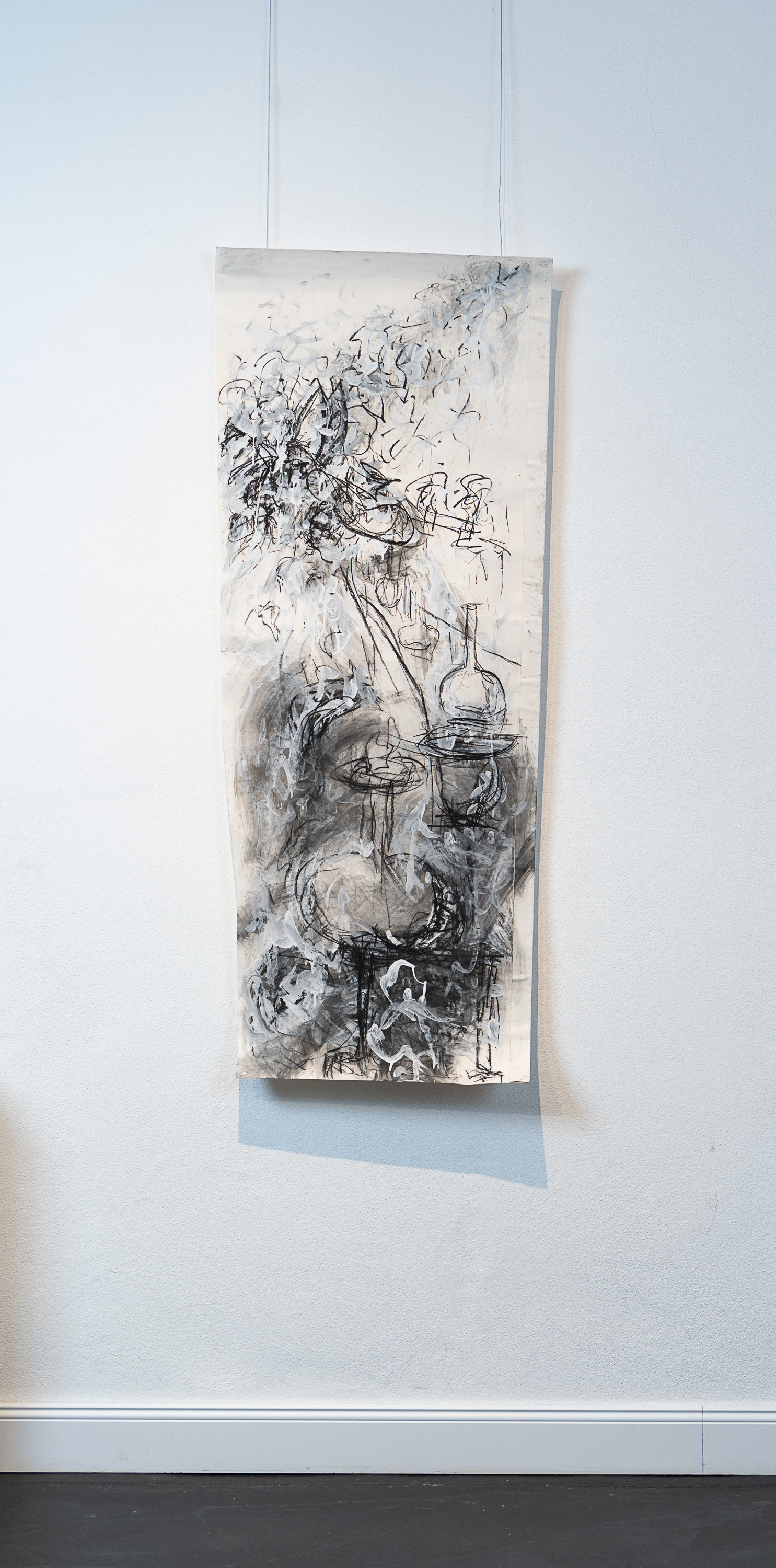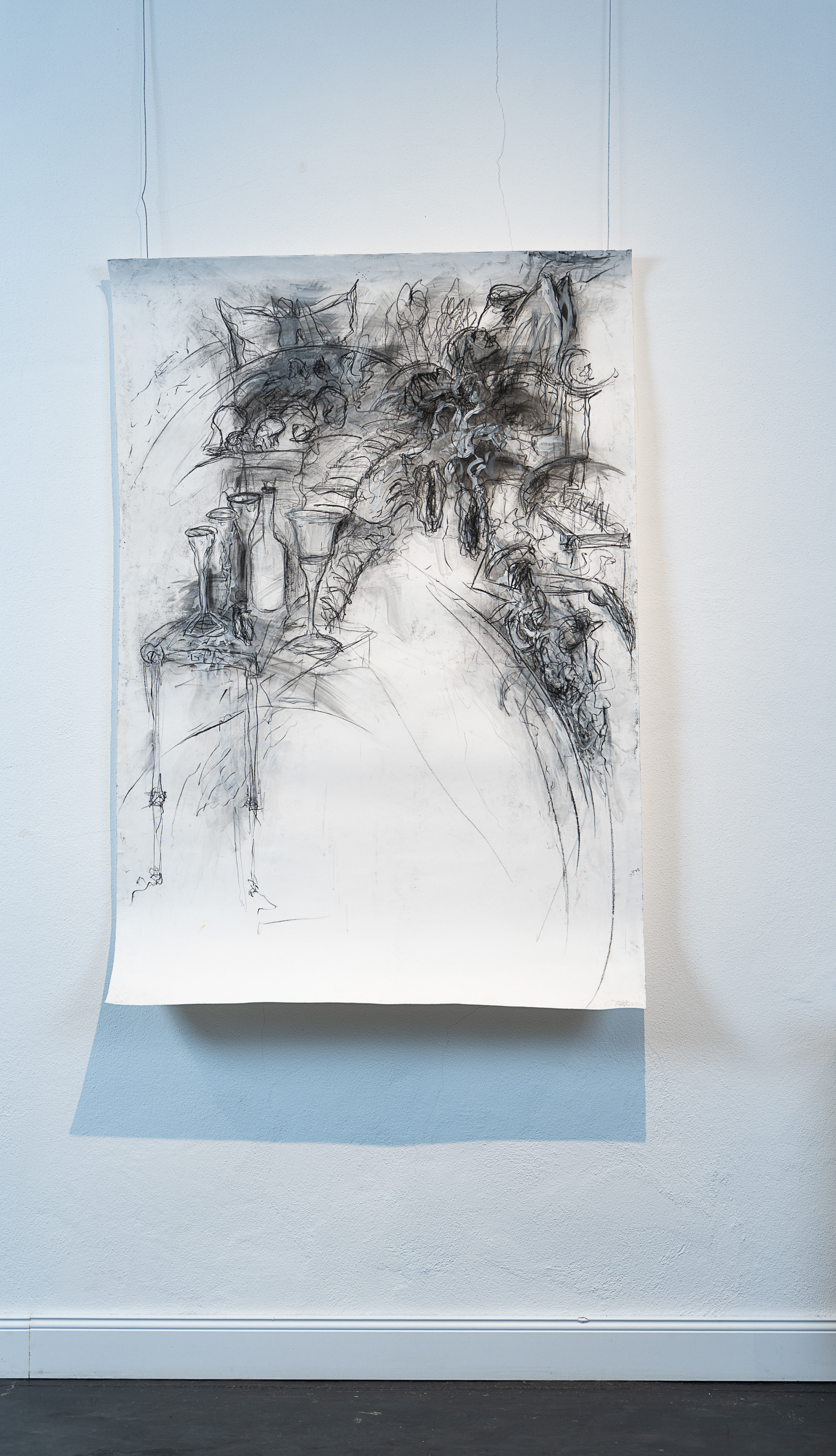 Aus dem weissen Nichts entsteht, in mehreren Schichten und in einer Mischtechnik aus Kohle, Kreide, Grafit und weisser Acrylfarbe, ein dynamisch bewegter Bildraum.